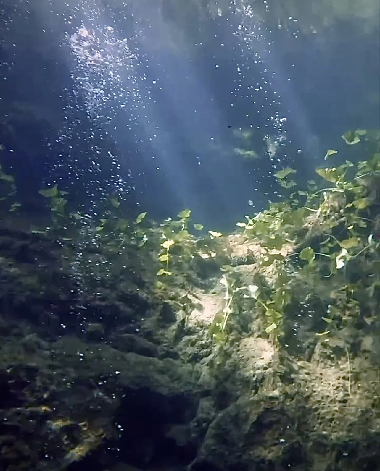 This cenote is shaped like a bottle of wine. In the lower chamber, you’ll see the impressive bell formations covering the ceiling. There is a hydrogen sulfide cloud around 35m deep just below the talus cone.